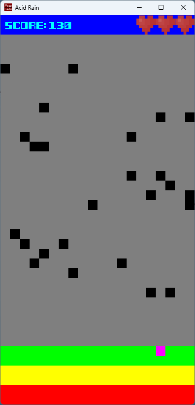 Acid Rain is both a casual and challenging game for when you need to just kill some time. Think Flappy Bird. It was developed in C++ using the SFML framework.