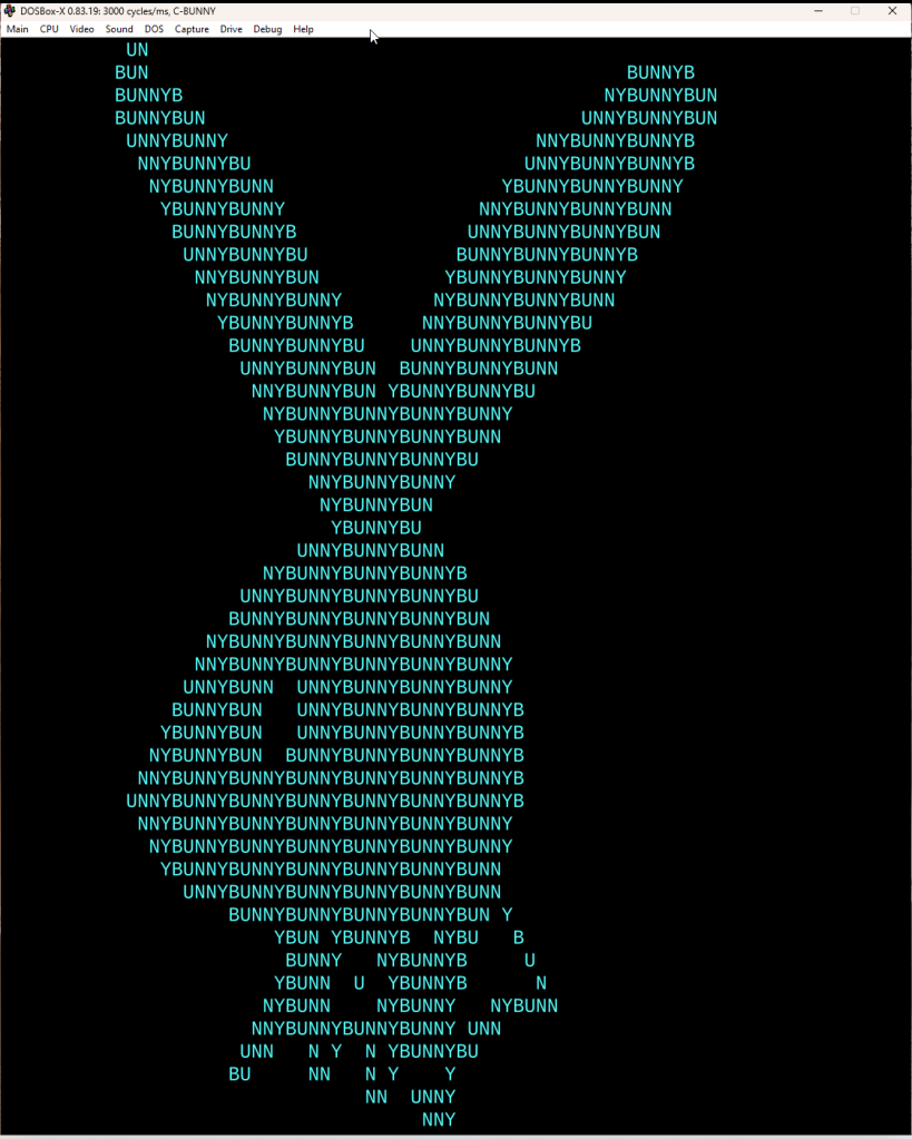 C-BUNNY is a port of the program called BUNNY in the book BASIC COMPUTER GAMES by David H. Ahl. I decided to make my own version of it in Microsoft QuickC. You’ll need an old computer equipped with MS-DOS or an emulator like DOSBox to run it. Source code is included.