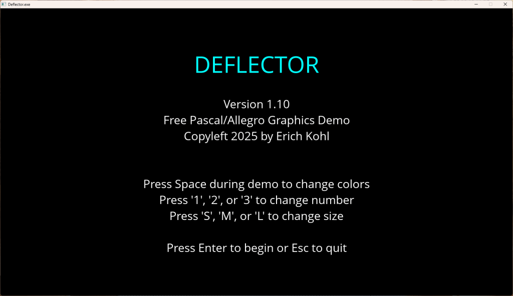 Deflector is a simple graphics demo written in Pascal. Mainly it was an exercise in learning how to use the Allegro framework. Source code is included (version 1.10 contains some nice enhancements).