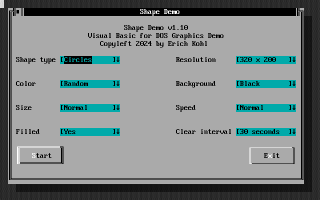This is a simple graphics demo for MS-DOS, written in Visual Basic (for DOS). I always wanted to write something for VBDOS, and this was an excuse to do so. Version 1.10 contains a handful of minor updates. Source code is included.