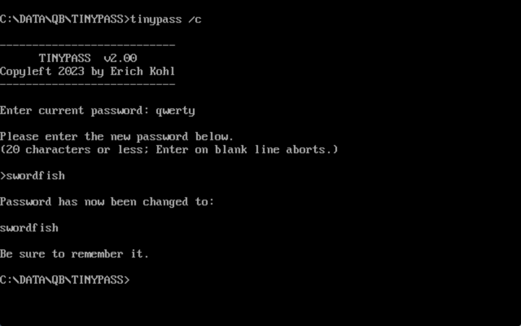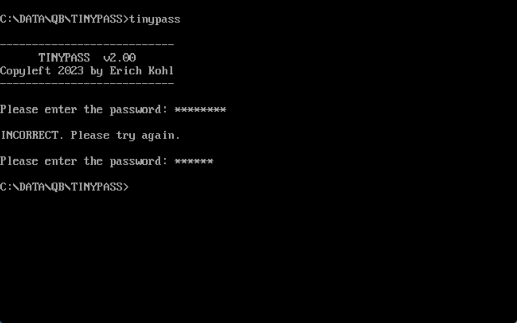TINYPASS is a small utility for MS-DOS that acts as a sort of “barrier,” where you define a password that must be entered, and if the correct password is not given then the program will lock up the system.